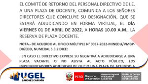 NOTA: La adjudicación se realizará el día viernes 01-04-22 a las 10:00 horas de acuerdo a comunicado de manera virtual, solo se permitirá el acceso mediante la plataforma ZOOM a los directores que concluyen su designación, por lo que deberán ingresar con su respectivo nombre de lo contrario serán expulsados de la sala.